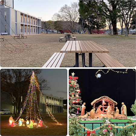 校庭には、上智大学短期大学部ソフィア会からの創立50周年記念品として、ベンチ3台が設営されており、学生のみなさんは大いに活用してもらっているとの、お話がありました。隣には美しいクリスマス装飾もありました。秦野での50年分のキャンパス・ライフに想いを馳せる一日でした。