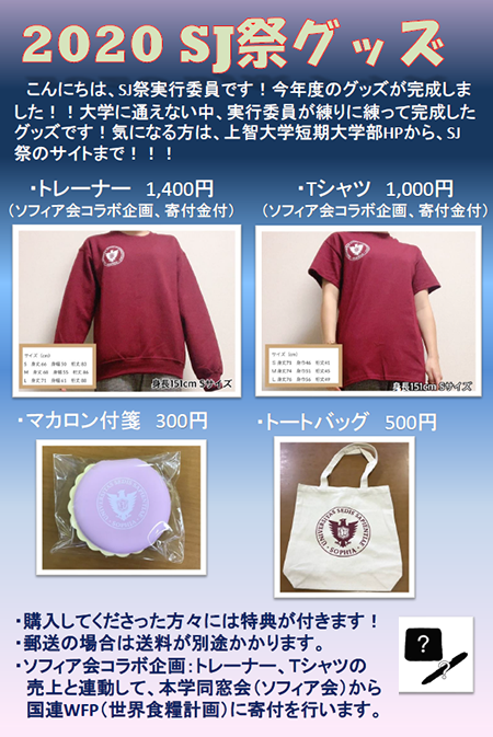 ホーム 上智大学短期大学部ソフィア会 活動紹介VTR(視聴10月25日まで)&オンラインSJ祭2020実行委員企画寄付金付きソフィアグッズ販売(10月14日~10月24日)
